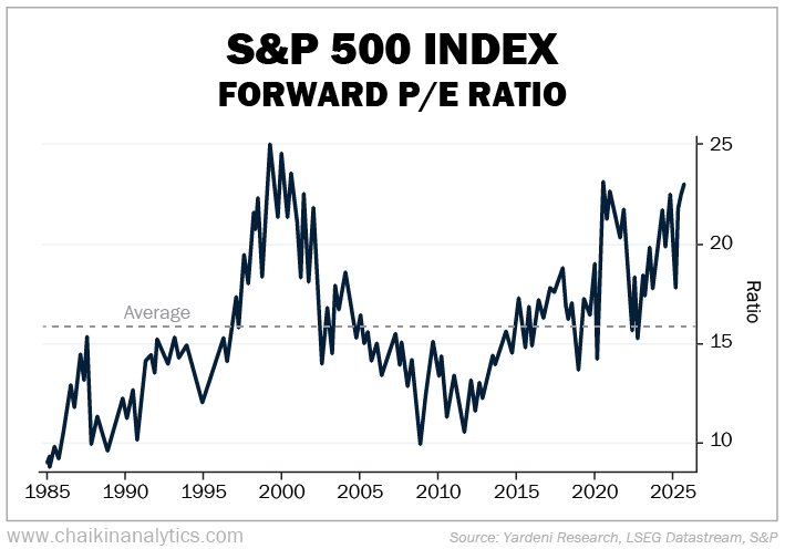 Today, the market is trading at a forward P/E ratio of around 23 times. That's roughly 44% higher than its historical average.