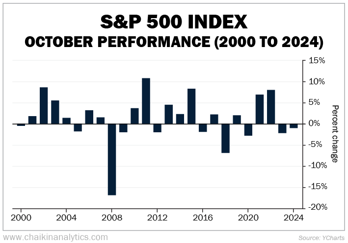 As you can see, October has generally been good for the stock market over this time frame. The S&P 500 gained in 15 instances. And it fell in 10 instances.