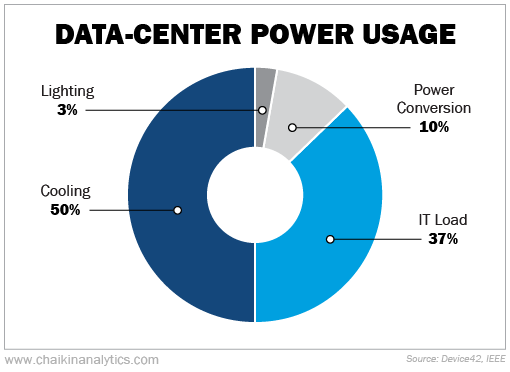 A data center this big would require 20 megawatts ("MW") of electricity to function. And that includes cooling, which accounts for the bulk of the consumption. Here's how it typically breaks down...