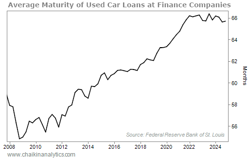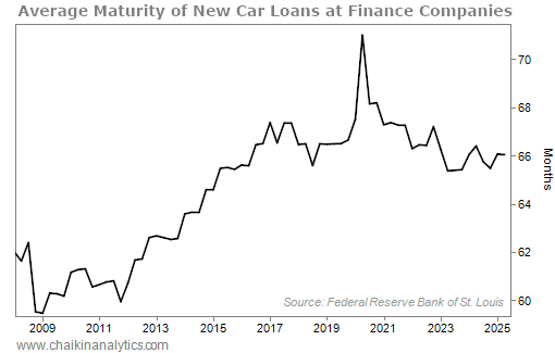 Since 2009, the term length of consumer loans has surged higher. It's easiest to see this in auto loan data.